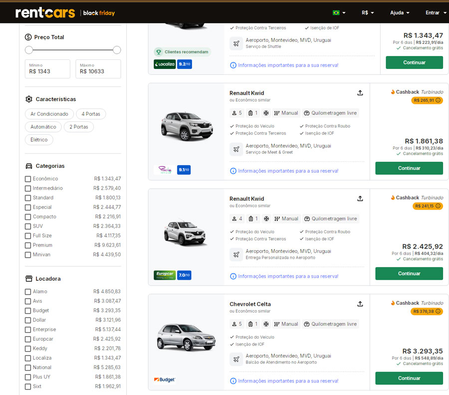 Depois, caso queira, pode usar os filtros para aprimorar a sua busca com o que deseja: carro econômico, compacto SUV, etc. E ainda pode eleger a locadora, como Avis, Europcar, Localiza, Alamo, etc.
