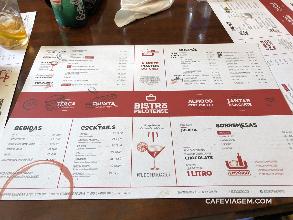 Enfim, se estiver em Pelotas (ou próximo) procure pelo Bistrô Pelotense. Vale muuuito a pena. Um ícone da gastronomia de Pelotas. À noite, o ambiente é iluminado com velas. O almoço para 5 pessoas (casal, minha mãe e meus filhos) com sobremesa custou em torno de R$ 150 (valor em fevereiro de 2018).