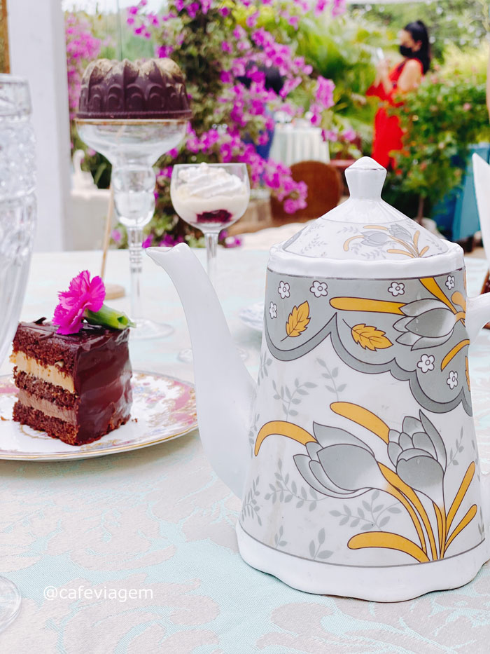 Achei tudo muito delicado, das louças a decoração da mesa. Mas a grande atração são mesmo os doces, tudo que provei adorei. São cerca de 20 variedades de mini porções, dispostas em louças em formato torre, muitas garimpadas em antiquários.