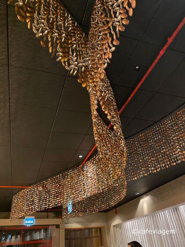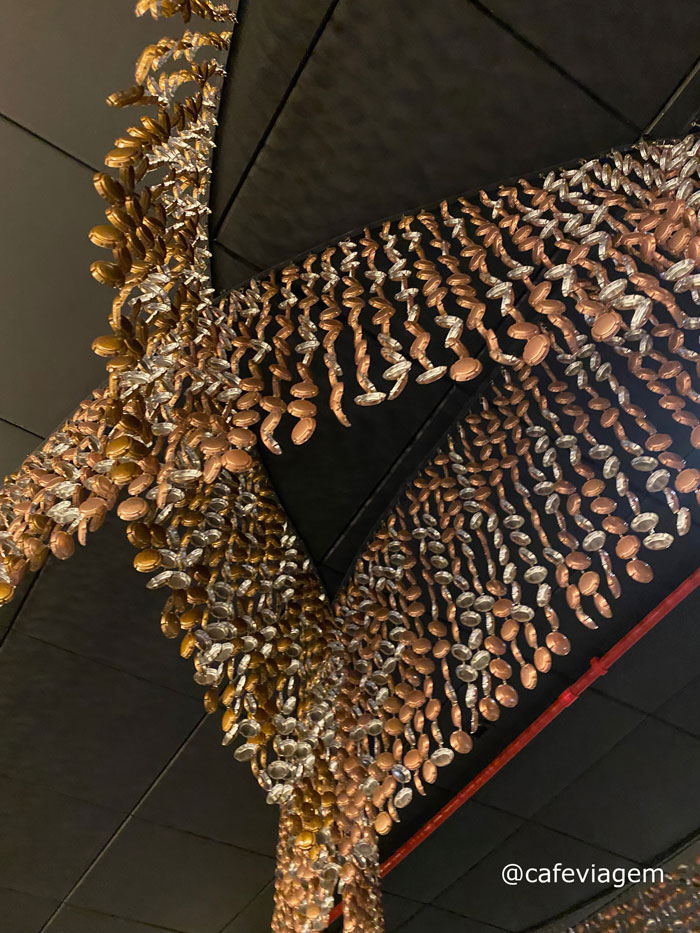 Inicialmente, não deixe de admirar a escultura no teto feita de chapéus e gaiolas de arame de espumantes (a tampa). São mais de 12 mil muselet para compor a obra que parece um grande lustre de cristal, lindoooo.