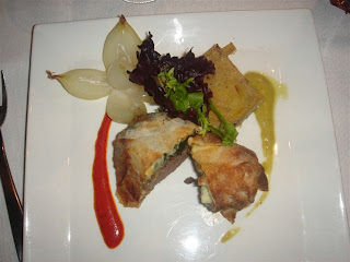 Importante: não esqueça nunca de fazer a reserva antecipada, em qualquer lugar que você escolher para jantar, pois a cidade costuma estar repleta de turistas. Basta pedir ao recepcionista do seu hotel, eles conhecem praticamente todos os restaurantes. Meu prato, modéstia a parte, foi o melhor da mesa: filé empanado com espinafre (envolto por aquela massa folhada fininha dos deuses), acompanhado de uma batata maravilhosa (não lembro como era feita).