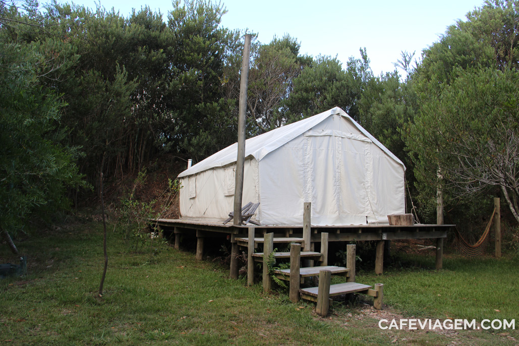Um dos motivos que elegemos La Pedrera para nos hospedarmos em família foi a curiosidade de conhecer uma hospedagem diferenciada nessa região. Trata-se do Pueblo Barrancas, um ecolodge com barracas rústica e outra mais completas e equipadas. A localização é um dos pontos altos do Pueblo Barrancas que fica em frente ao mar e cercado por uma linda área verde. Fazia um tempinho que eu namorava esse hotel no Booking.com e consegui uma tarifa especial. Veja tarifas neste link! Nós pagamos para toda a família na alta temporada US$ 150 dólares (mas foi uma negociação especial). Não é um hotel barato.