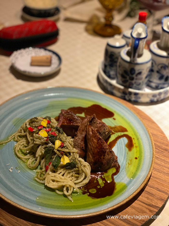 Outro prato que provei (minha filha pediu) e recomendo fortemente é o Lombo de cordeiro no forno a lenha, servido com espaguete ao pesto de hortelã. Perfeita combinação. Outras carnes do cardápio são: Matambre, Costela, chuleta, frango e a bisteca.
