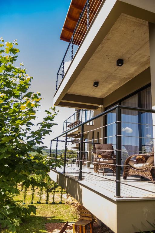 Uma proposta jovem e moderna de acomodação no Vale dos Vinhedos. Oferece conforto e vista. Suítes contam com banheira de hidromassagem e cozinha completa. Sem dúvida, uma pousada de luxo com estrutura incrível e bem localizada! Próximo à vinícola Larentis e à Casa Valduga. Sem falar da cozinha que é bem equipada e conta, inclusive, com churrasqueira.