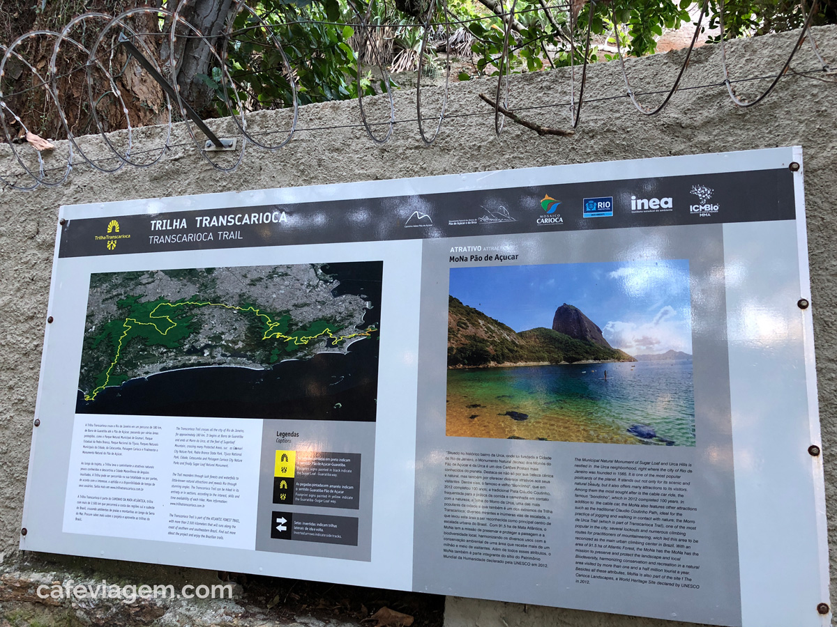 Placa indicando o caminho para trilha da subida do Morro da Urca na Pista Claudio Coutinho
