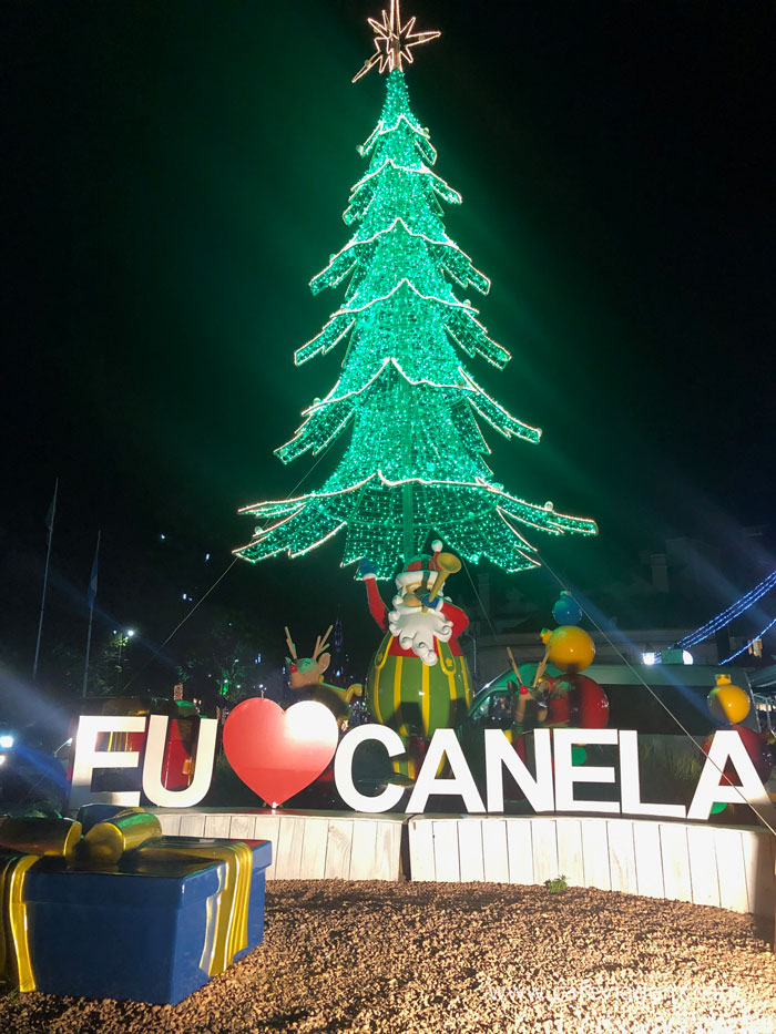 • Árvore com letreiro Amo Canela em frente à Praça João Correa