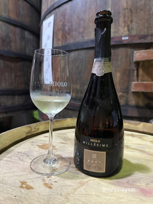 Fiz o Tour Giuseppe Miolo que inicia no vinhedo-modelo e passa pela Cantina Histórica — onde degustamos um, pasmem, espumante Miolo Millésime. Ou seja, um tour que já inicia com uma degustação premium. Afinal, o Miolo Millésime é um espumante de método tradicional, produzido somente em safras excepcionais com uvas de Chardonnay e Pinot Noir, cultivadas nos vinhedos da família Miolo em uma região que dá origem a um dos melhores espumantes do Brasil.