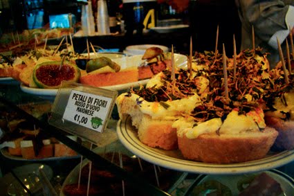 Veneza é sensacional. É linda, é chique, é fácil de se achar e ao contrário do que muitas pessoas nos falaram, não tem cheiro ruim. Tem, sim, são muitos turistas, mas eles estão só nos pontos turísticos, e não misturados com os venezianos. E como o que a gente realmente gosta é “se misturar”, acabamos não sendo afetados por toda a multidão. Pois foi numa dessas caminhadas de canal em canal, fora do roteiro tradicional, que encontramos a Cantina Del Vino Gia Schiavi, na ponte S. Trovaso. Trata-se de uma vineria, com uma variedade enorme de vinhos e de guloseimas. Funciona assim: tu entra, escolhe um tipo de vinho (que pode ser uma garrafa ou um copo), seleciona uma meia dúzia de pãeszinhos maravilhosos, paga e vai ali pra fora degustar de tudo e observar as pessoas se movimentando. Muito, mas muito legal. O lugar tava cheio de gente bacana e nenhum turista além de nós, que resolvemos ir pro outro lado da ponte pra passar despercebidos e assistir de camarote o que dava a entender ser um legítimo happy hour em Veneza. Amei muito.