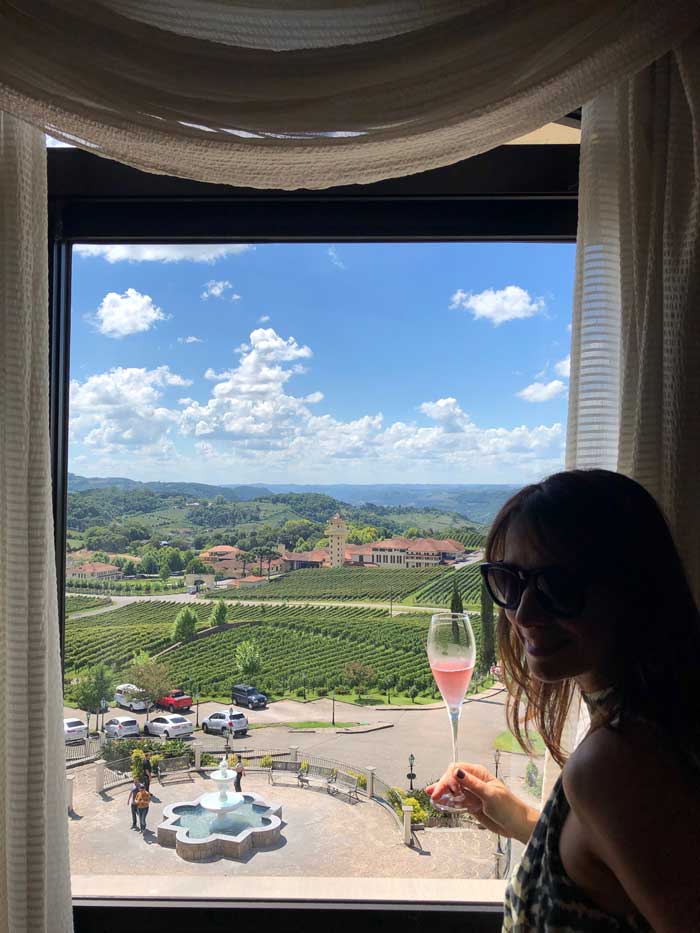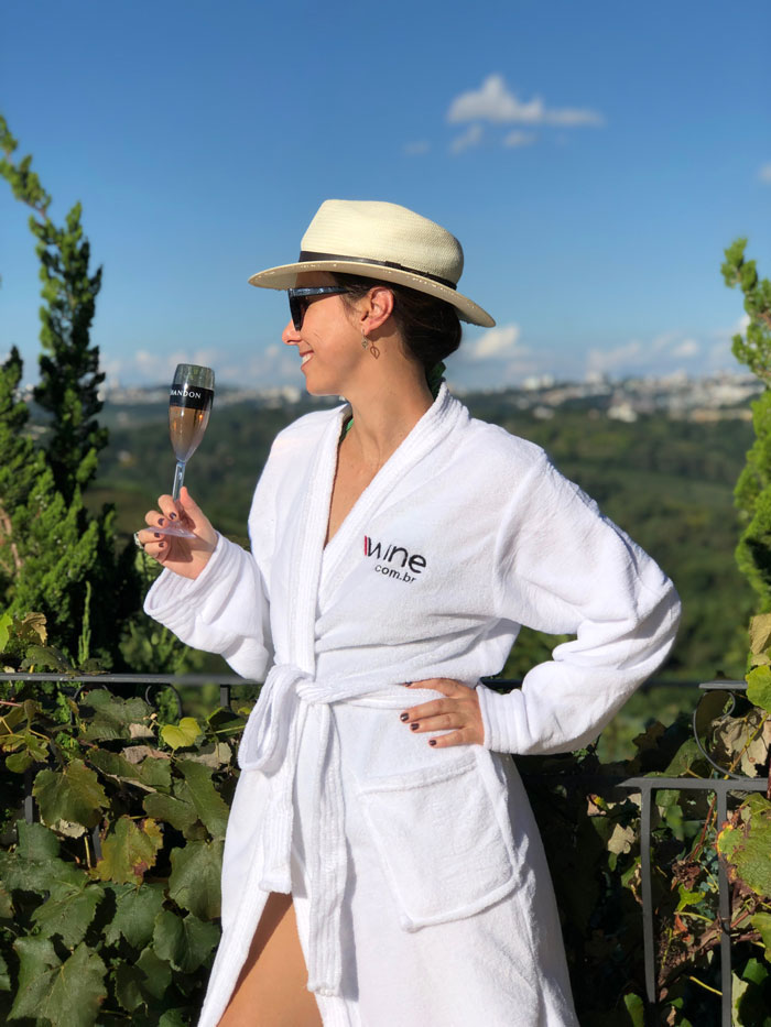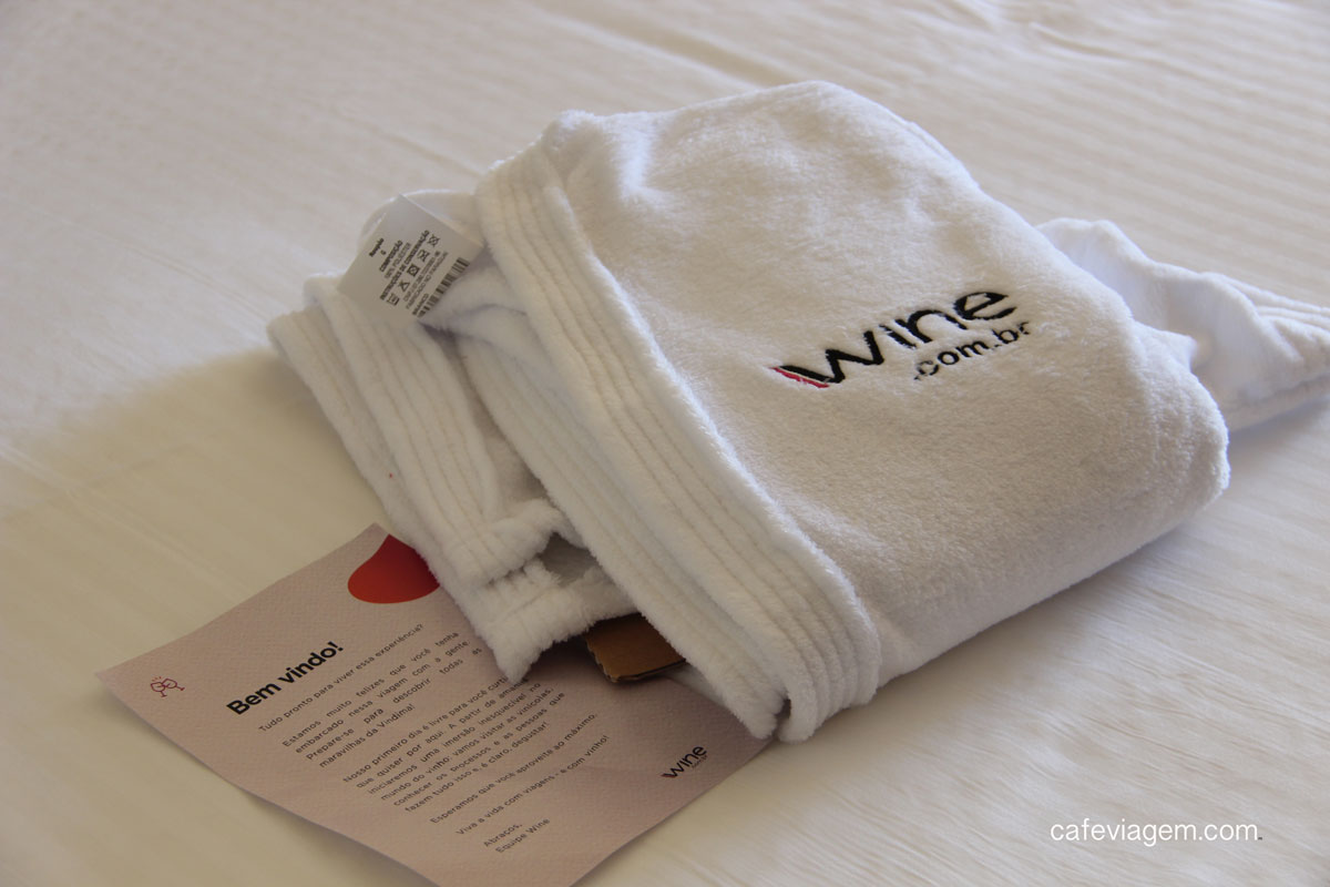 Cheguei na sexta-feira à tarde, sorridente com o lindo dia de sol e céu azul. A primeira surpresa do dia foi ao entrar na minha acomodação e encontrar dois mimos lindos da Wine para os sócios: espumante de boas vindas e um roupão macio com a logomarca da Wine e que a-do-rei. Aí foi só abrir a janela para querer literalmente mergulhar naquele cenário incrível do Vale dos Vinhedos. Sim, me joguei na piscina.