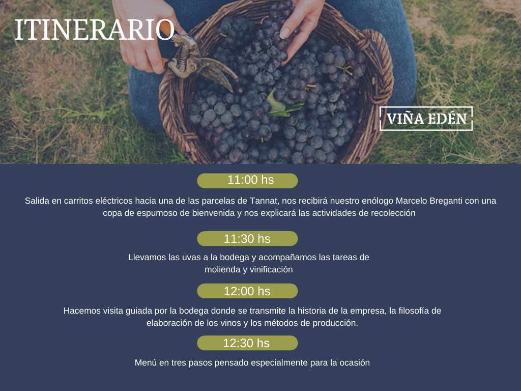 Colheita e conversa sobre a vinha com vinicultor. Recepção de uvas no pátio de recepção da Bodega Garzón e passeio pelas instalações com o enólogo. Jantar na Plaza de Pueblo Garzón com nosso Chef Embaixador Francis Mallmann e seu cardápio de fogueiras. Venda de produtos na Boutique Village.