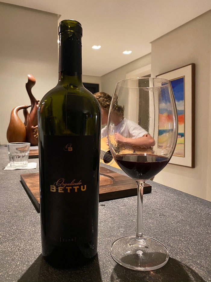 Mais tarde, abrimos um tinto impressionante de Orgalindo Bettú: um Cabernet Franc 2008. Vinho vivo, cor rubi com pouquíssimos tons de envelhecimento. Em boca macio, frutas negras, tostados, boa acidez em equilíbrio com álcool tanino. Baita vinho.