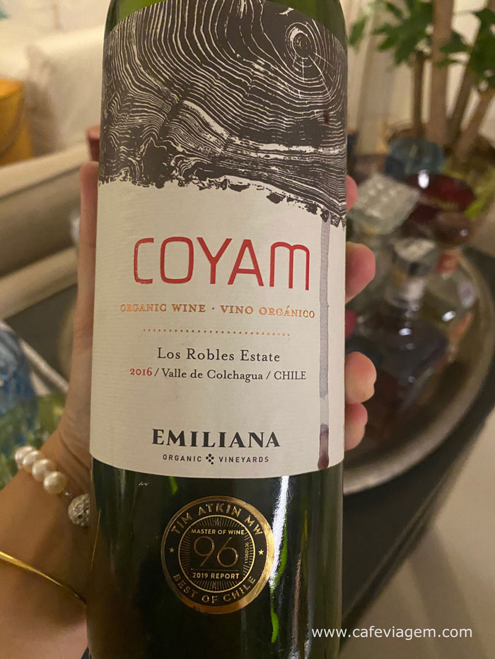 Do Chile, degustamos um vinho de entrada da vinícola orgânica e biodinâmica Emiliana, um Adobe Gewurztraminer. Não trouxemo de viagem, compramos no supermercado mesmo. Para o meu paladar, é um vinho aromático demais. Na sequência, experimentamos um vinhaço da mesmo vinícola, só que desta vez um blend tinto, o Coyam. Trata-se de um ícone da Emiliana (junto com o Gê). No último Guia Descorchados, o Coyam ganhou 95 pontos. Meu marido trouxe este vinho de viagem ao Chile para esquiar em 2019. Durante a ocasião, ele visitou duas vinícolas perto de Santiago do Chile: Cousiño Macul e Aquitania.