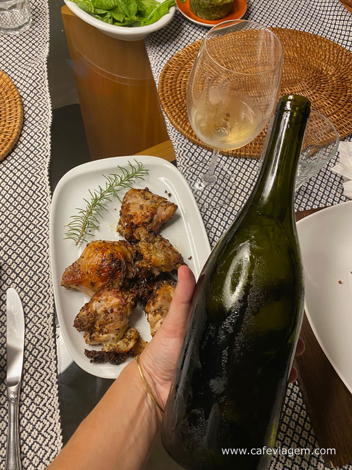 Outros dois vinhos brancos brasileiros surpreendentes que abrimos na quarentena – e que recomendo fortemente !- vieram da minha última visita à serra gaúcha quando conheci a vinícola do enólogo Orgalindo Bettú. Depois de anos na vinícola Vila Francioni de Santa Catarina, Bettú está lançando seus vinhos próprios. O post da visita e degustação está no blog cafeviagem.com. Abrimos na quarentena o Sauvignon Blanc Dona Fátima 2014 (maravilhoso) e o Chardonnay 2017 (ainda em rótulo, na foto degustado com um frango no airfry).