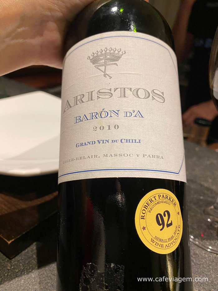 Dias depois, com hambúrguer caseiro (carne do mercado Ferrari de Porto Alegre), degustamos um nobre presente de um amigo, o Aristos Barón D’A 2010. Trata-se de um blend tinto de respeito (Cabernet Sauvignon, Syrah, Petite Sirah e Merlot), da mais comentada vinícola boutique chilena da atualidade. Seus vinhos são elegantes e com personalidade borgonhesa.