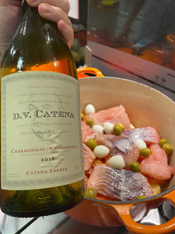 De Mendoza (Argentina), são os vinhos que mais temos guardados em nossa adega. Acredita que ainda restam alguns vinhos que compramos na viagem a Mendoza em 2017? Poucos, mas restam. Bem, dos brancos degustamos um Chardonnay DV Catena Zapata 2016 (Chardonnay de dois vinhedos). Aliás, este vinho é considerado uma das grandes referências para brancos maturados em barricas de carvalho produzidos na América do Sul. Super elegante e agradável em boca. Foi degustado com prato que meu marido faz dos tempos de pescaria: bagre ensopado, uma delícia.