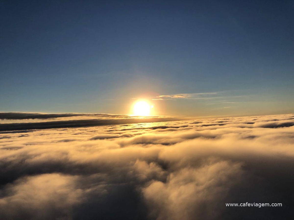 Quando o balão subiu, nossa, gritei e rezei. Quase não consegui fotografar ou filmar nada. E então fomos subindo, subindo e subindo mais. E já que as condições estavam perfeitas, passamos pelas nuvens e vimos o nascer do sol. Abre parênteses: passar a camada das nuvens num balão como fizemos esta manhã em TORRES RS é algo raro. Afinal, nem sempre as condições do tempo e do vento permitem (olha aqui nos DESTAQUES do perfil @cafeviagem no Instagram ). E mais raro ainda é eu ter coragem de enfrentar as alturas para entrar em um balão 😱
